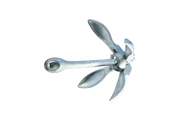 Ein feuerverzinkter, zusammenklappbarer Schirmanker, leicht verstaubar.